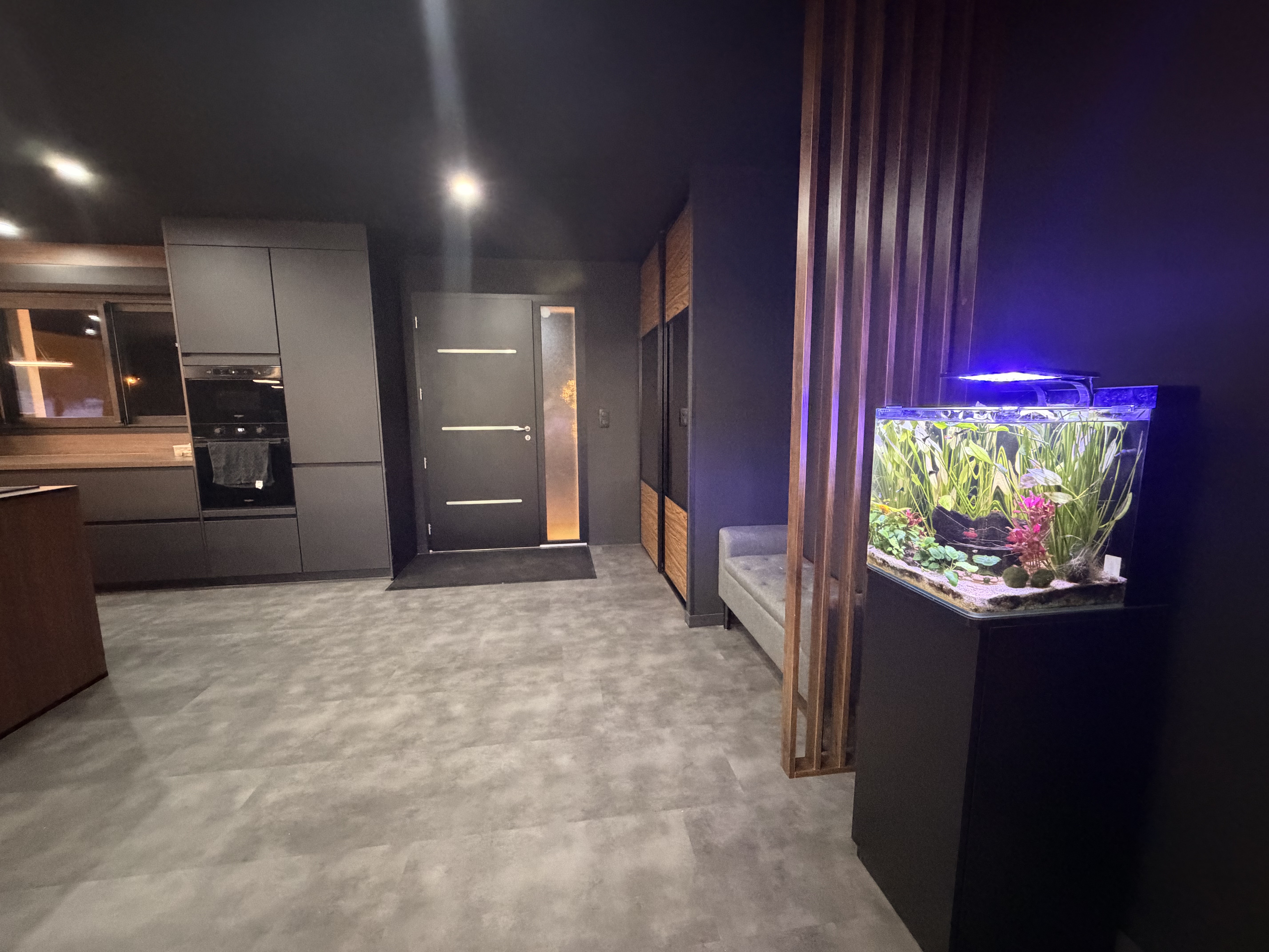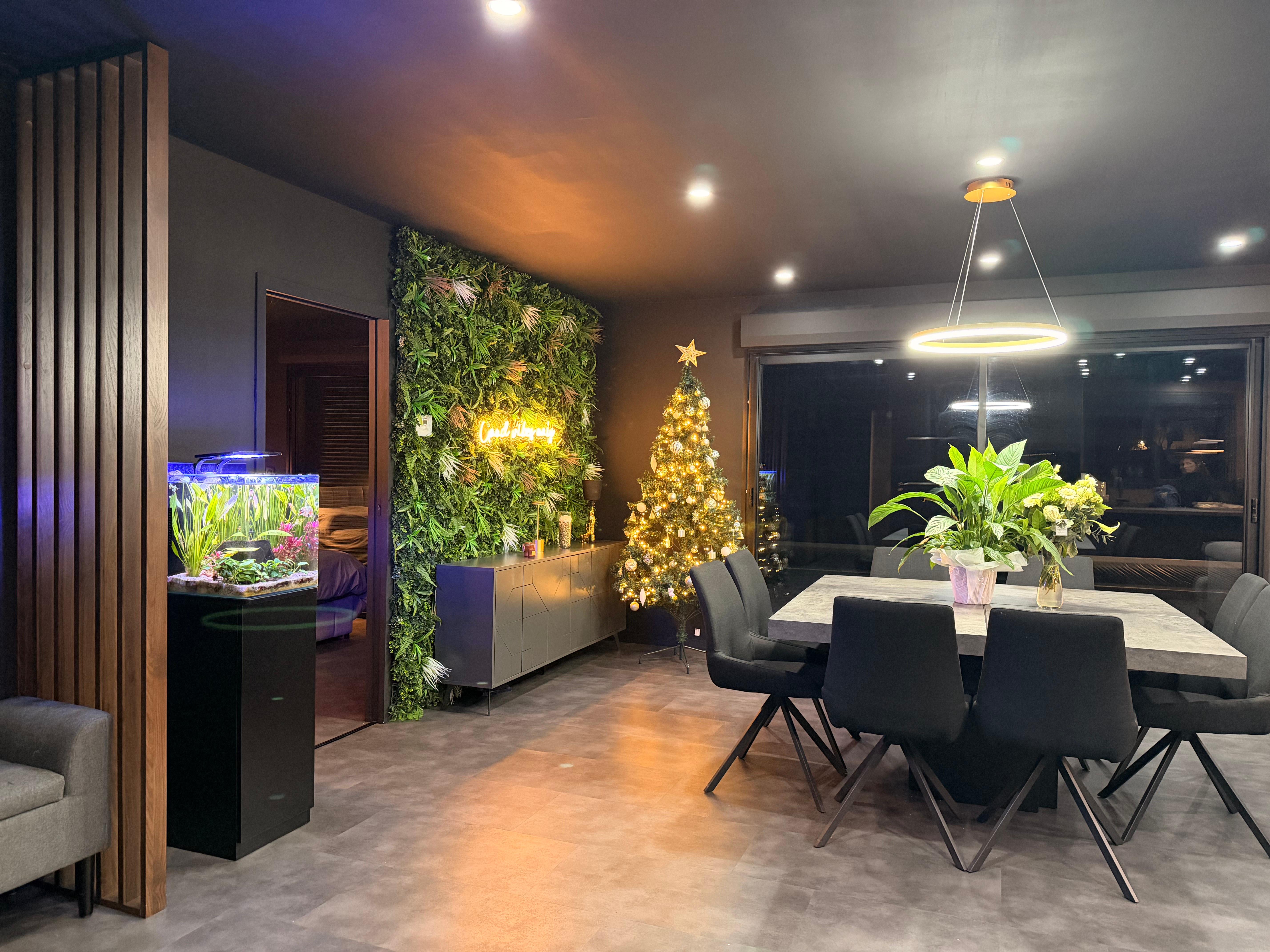 - ★ Espace de Vie Moderne : Un salon-séjour baigné de lumière avec un aquarium design, une décoration végétale murale rétroéclairée et un mobilier contemporain.